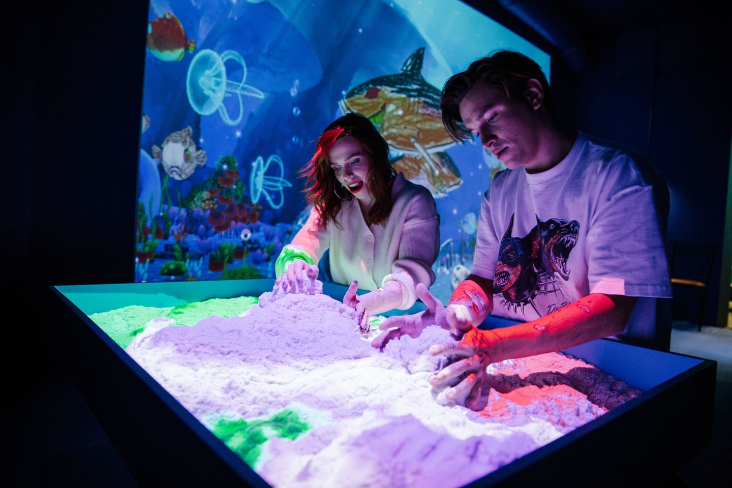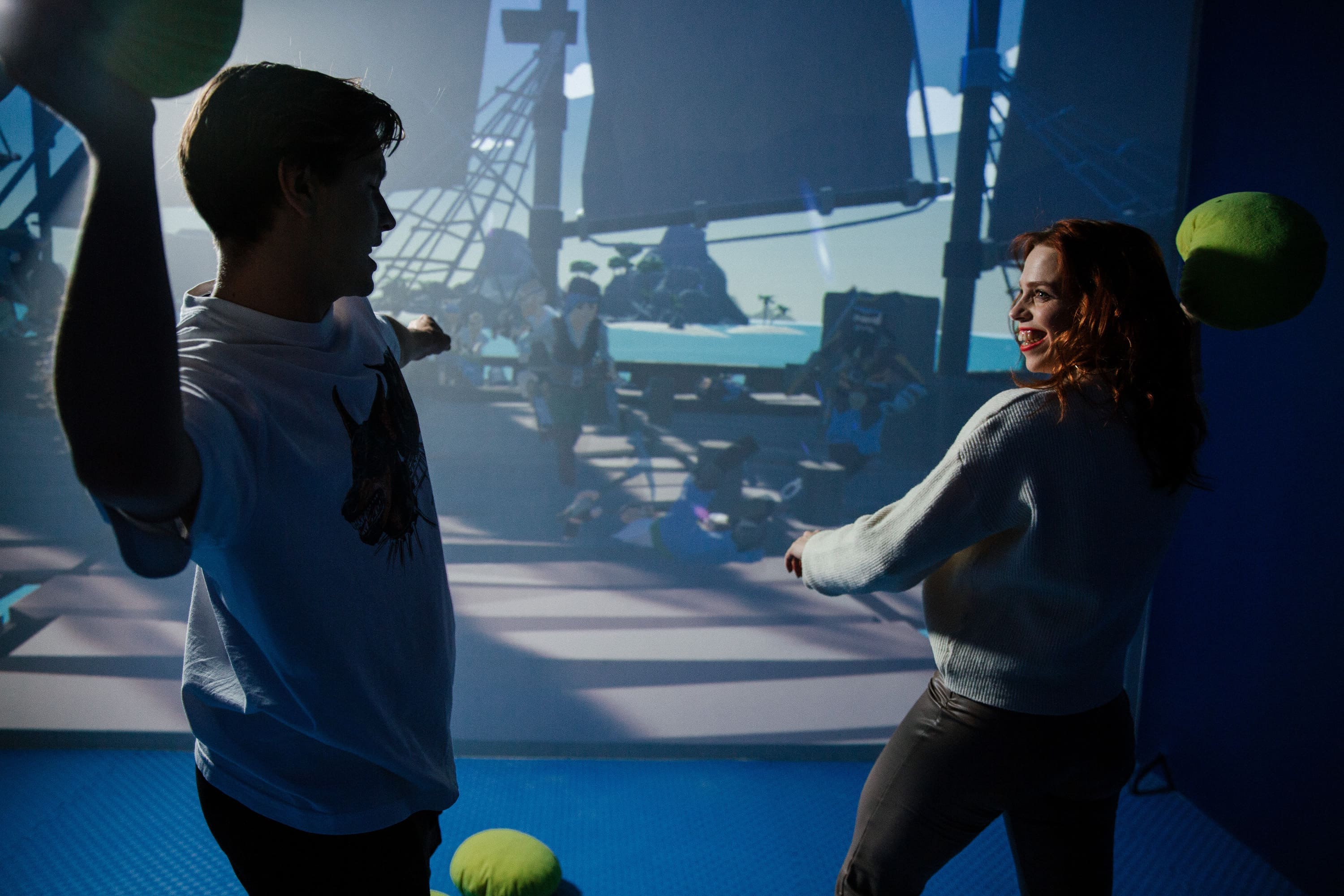 Вы попадете в мир дополненной реальности, где можно прикоснуться к интерактивным проекциям, которые реагируют на движения и прикосновения. Вы сможете оживить нарисованные предметы в виртуальной реальности, сразиться с пиратами и пираньями, построить замок из кинетического песка и пострелять из тира.
